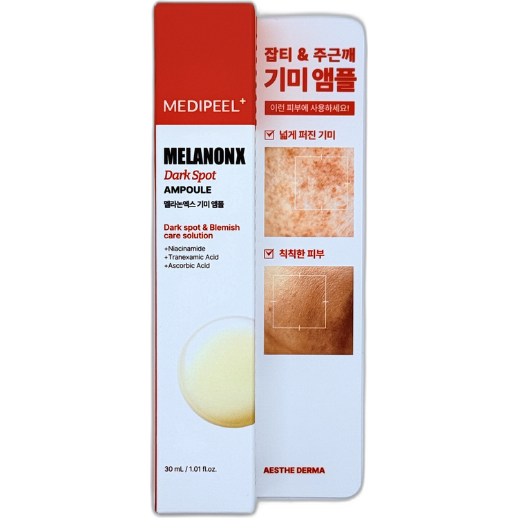 到期日: 08/2028 ## MEDIPEEL+ MELANONX 祛斑精華:專業級淡斑方案 MEDIPEEL+ MELANONX 祛斑精華是一款高濃縮配方的護膚精華,專為改善肌膚色素沉澱、淡化色斑而設計。 這款精華蘊含多種強效活性成分,針對黑色素生成的各個環節,從源頭抑制到表皮代謝,全方位改善膚色不均,重現肌膚勻淨透亮。 經過臨床測試驗證,MELANONX 祛斑精華能有效減淡頑固色斑、雀斑、曬斑,並能提亮整體膚色,使肌膚煥發年輕光彩。 其溫和配方即使是敏感肌也能安心使用,讓您在家也能享受專業級的淡斑護理。 MEDIPEEL+ MELANONX 祛斑精華的核心成分包括強效的美白成分煙酰胺、傳明酸和抗壞血酸,能有效抑制黑色素的產生,減少色素沉澱。 此外,精華中還添加了多種植物提取物,如甘草根提取物和綠茶提取物,具有舒緩、抗炎和抗氧化的功效,能有效保護肌膚免受外界環境的侵害,促進肌膚健康。 精華質地輕盈易吸收,不會給肌膚造成負擔,適合所有膚質使用。 持續使用 MEDIPEEL+ MELANONX 祛斑精華,您將能明顯感受到肌膚色斑的淡化,膚色更加均勻透亮,肌膚也更加健康有活力。 配合正確的防曬措施,能更好地保護肌膚免受紫外線的傷害,防止新的色斑形成,讓肌膚長期保持健康美麗。 **重點功能:** * **強效淡斑:** 針對黑色素生成各個環節,有效減淡色斑、雀斑、曬斑。 * **抑制黑色素:** 煙酰胺、傳明酸和抗壞血酸三重美白成分,抑制黑色素生成。 * **提亮膚色:** 改善膚色不均,使肌膚更加均勻透亮。 * **舒緩抗炎:** 甘草根和綠茶提取物舒緩肌膚,減少炎症反應。 * **抗氧化保護:** 保護肌膚免受自由基侵害,延緩肌膚老化。 * **輕盈易吸收:** 質地清爽不油膩,易於肌膚吸收,不造成負擔。 * **適合所有膚質:** 溫和配方,敏感肌也能安心使用。